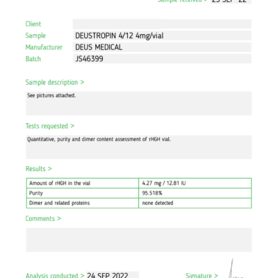 Deustropin 4/12 je syntetický lidský růstový hormon sestávající z polypeptidu se 191 aminokyselinami. Díky svým jedinečným biochemickým vlastnostem je tato sloučenina vysoce účinná při léčbě poruch hmotnosti a růstu.