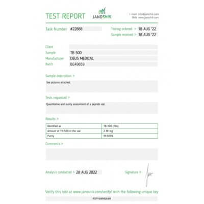 Elk flacon bevat 2 mg werkzame stof. TB-500werkt door snellere celmigratie en beter weefselherstel te bevorderen. Het wordt onder de huid of in de spier geïnjecteerd.