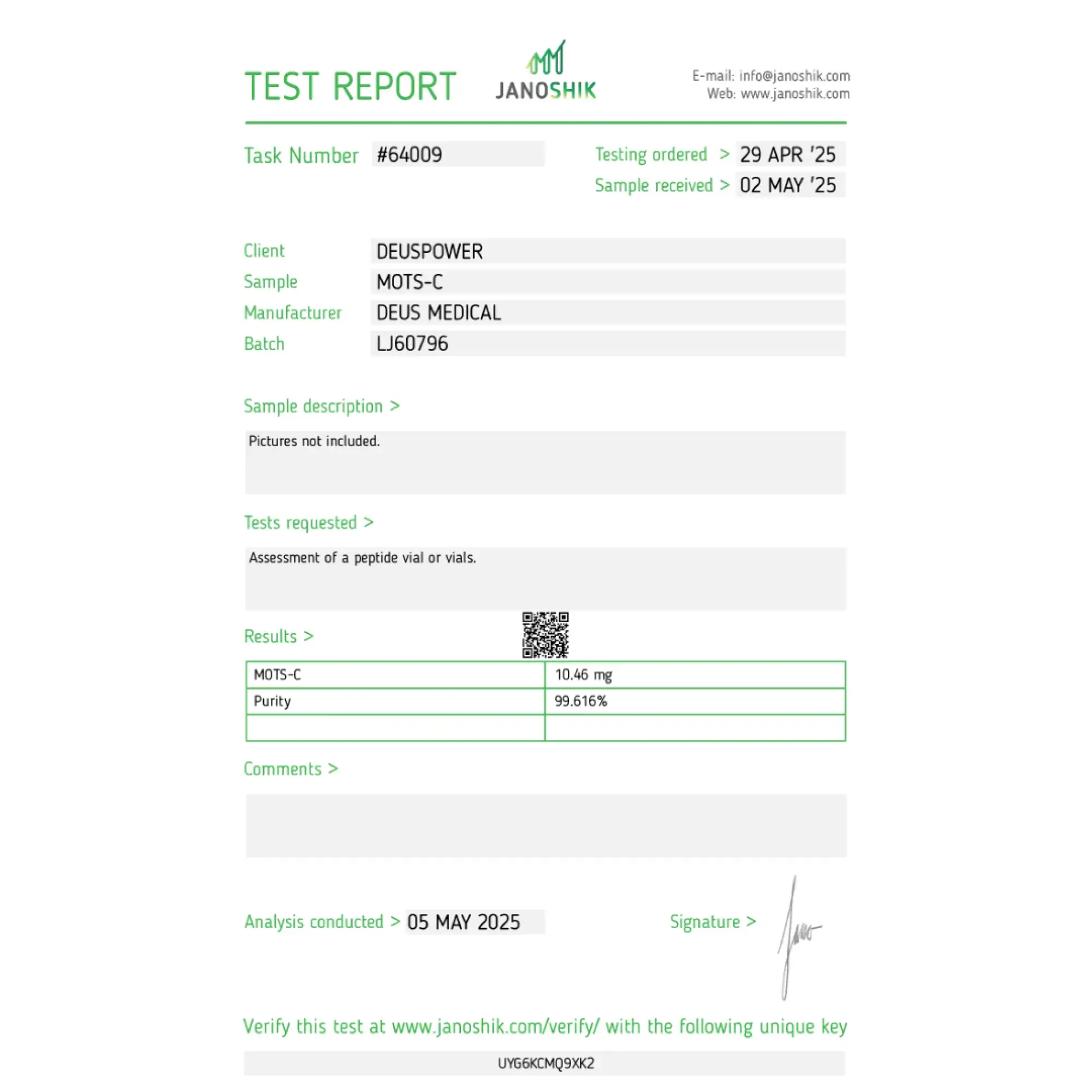 MOTS-C är en mitokondriehärledd peptid som spelar en avgörande roll för att reglera metabolism och cellulär energi. Den är kodad i mitokondriellt DNA, snarare än kärn-DNA, och är involverad i att upprätthålla metabolisk homeostas genom att främja glukosmetabolism, förbättra insulinkänsligheten och skydda mot metabola sjukdomar. MOTS-C är också känt för sina potentiella fördelar inom anti-aging och muskelhälsa, särskilt i samband med att förbättra träningsuthållighet och metabolisk flexibilitet.